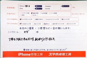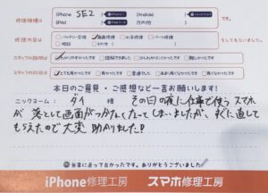 【iPhoneSE2の画面交換でお越しのスダ様へのスタッフからのコメント】